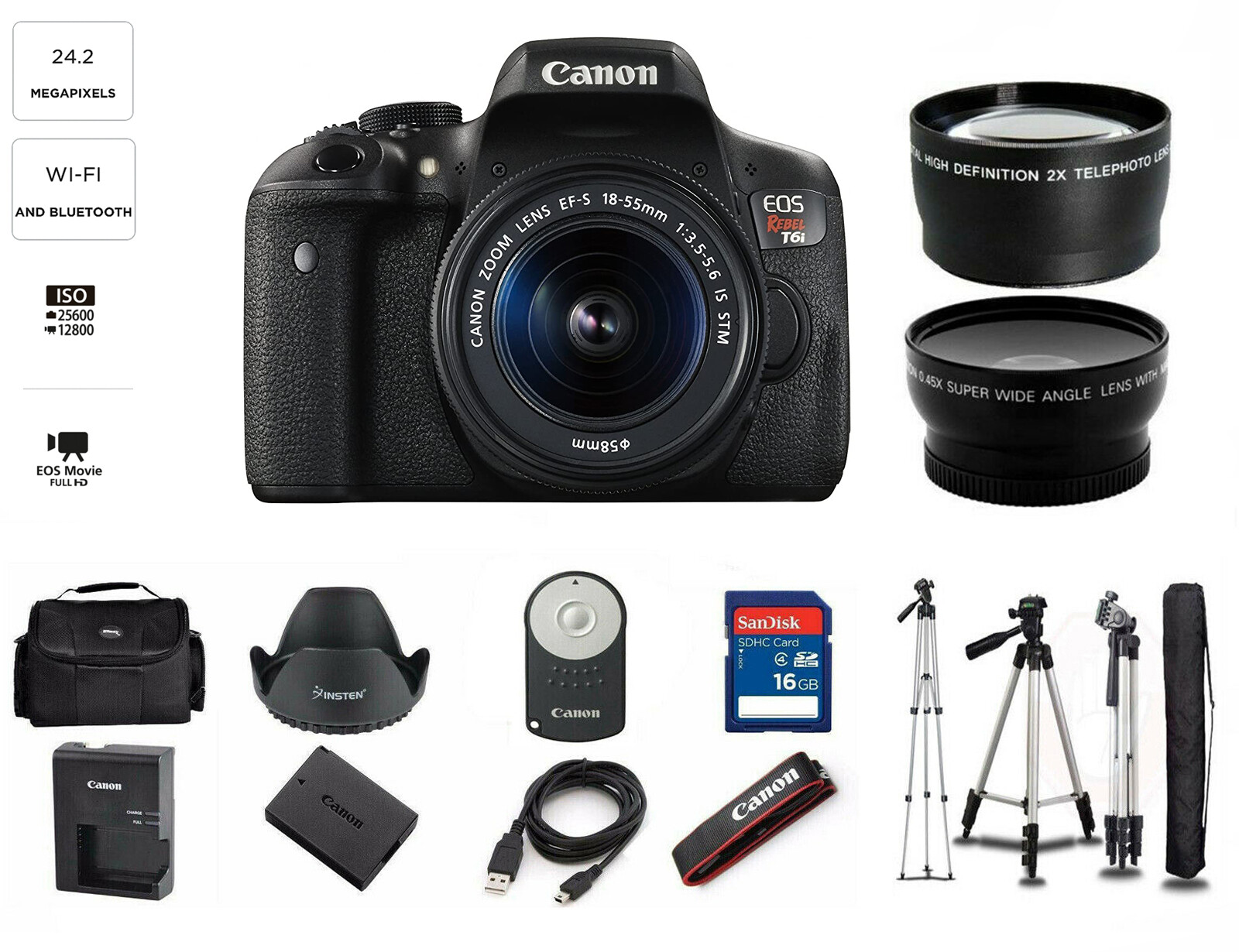Canon eos rebel t6i 24 2 mp cmos digital slr camera with 3 0 inch lcd with ef s 18 55mm f 3 5 5 6 is stm lens and ef 75 300mm f 4 5 6 iii lens wi fi enabled renewed 4 8 out of 5 stars 4 849 99 849.